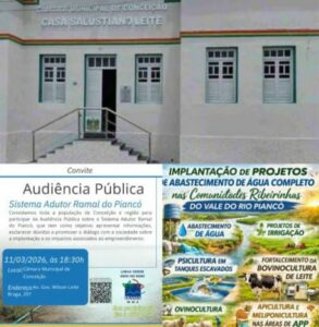 Representações das entidades componentes do Fórum Territorial do Vale do Piancó, Sertão paraibano, estarão reunidas nesta quarta-feira, 11 de março, às 18:30 horas, na Câmara Municipal de Conceição, numa Audiência Pública sobre o Sistema Adutor Ramal Piancó que tem como objetivo apresentar informações, esclarecer dúvidas e promover o diálogo com a sociedade sobre a implantação e os impactos associados ao empreendimento.