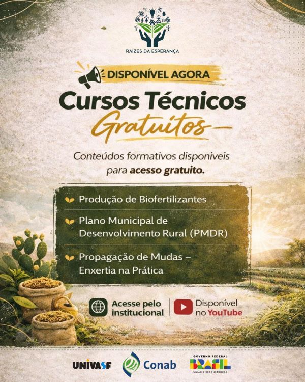 A Companhia Nacional de Abastecimento (Conab), empresa pública vinculada ao Governo Federal, em parceria com a Universidade Federal do Vale do São Francisco (Univasf), por meio do Projeto Raízes da Esperança, disponibiliza cursos técnicos gratuitos voltados à qualificação de agricultores, gestores públicos e demais atores do desenvolvimento rural no Semiárido brasileiro.