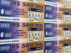 Os selos do Feminicídio Zero e do Ligue 180 estão estampados em bilhetes de mais de 13 mil casas lotéricas em todo o Brasil desde o dia 14 de dezembro. A divulgação das logomarcas celebra a parceria entre Ministério das Mulheres e Caixa Econômica Federal no âmbito das ações da Mobilização Nacional pelo Feminicídio Zero.