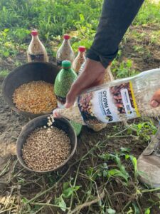 Alex explicou que são dois hectares plantados com milho Jaboatão, feijão-natal e feijão-rabo-de-peba que serão distribuídos dentro do programa municipal e criticou os históricos programas de sementes no Estado da Paraíba em que a entrega se dá fora de tempo com sementes que deixam espaço para constantes reclamações e possibilidade de insucesso na atividade camponesa. “Nós queremos, neste ano diferente, em que, graças a Deus, tem chovido bem aqui na nossa região do nosso município, com roçado já plantado e nós esperamos colher frutos, tendo em vista que este ano para o município de Santo André nós não recebemos sementes de programas de distribuição de sementes do governo do estado”, explica dizendo que produzir sementes é ter a autonomia necessária para gerar sistemas produtivos sustentáveis na agricultura familiar do município e da região. “Então veja bem, nós estamos a esta altura do mês de junho e o município não recebeu essas sementes, mas nós, numa ação inovadora, distribuímos quase mil quilos de sementes entre milho e feijão produzidas neste projeto e distribuídas já no mês de janeiro, e os agricultores puderam plantar por ser uma ação de multiplicar já no ano passado”, reafirma Alex situando ser uma área de multiplicação com dois hectares.