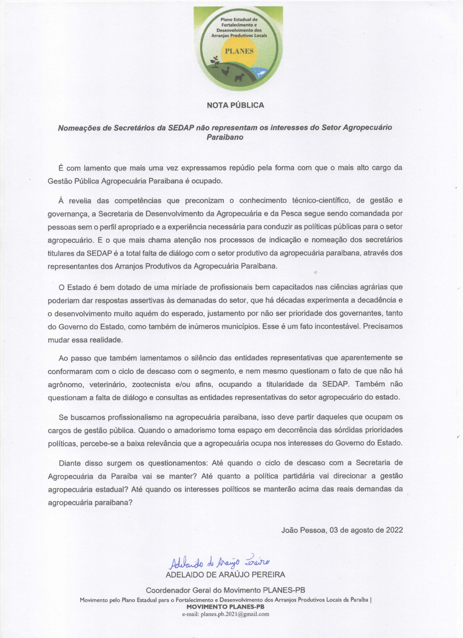 O anúncio de um novo secretário para a pasta do Desenvolvimento da Agropecuária e Pesca feito pelo Governo do Estado da Paraíba, sem identidade com o setor produtivo, gerou desagrado para com segmentos da agropecuária paraibana, componentes do Movimento Planes, Plano Estadual de Fortalecimento e Desenvolvimento dos Arranjos Produtivos Locais da Paraíba, fato que motivou o lançamento de uma nota de repúdio por parte do movimento tão logo tomou conhecimento do anúncio em favor do ex-prefeito da cidade de Riacho dos Cavalos, no Sertão do Estado, Joaquim Hugo Vieira Carneiro. “Em relação à nota que foi publicada, via Planes, nós temos a ciência que a nomeação para o cargo de secretário da Sedap é prerrogativa do governo do estado, no entanto o que queremos é que se tenha critérios técnicos de diálogo com o setor agropecuário pra fazer as nomeações na busca de colocar profissionais técnicos experientes, competentes, e que tenham o aval do setor ao invés de usar apenas o viés político para essas indicações o que, de fato, vem ocorrendo há muito tempo na Sedap”, explica o coordenador do Planes, Adelaido Pereira de Araújo, ao dialogar com Stúdio Rural.